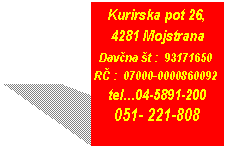 Kurirska pot 26, 4281 Mojstrana Davčna št : 93171650 RČ : 07000-0000860092 tel...04-5891-200 051- 221-808